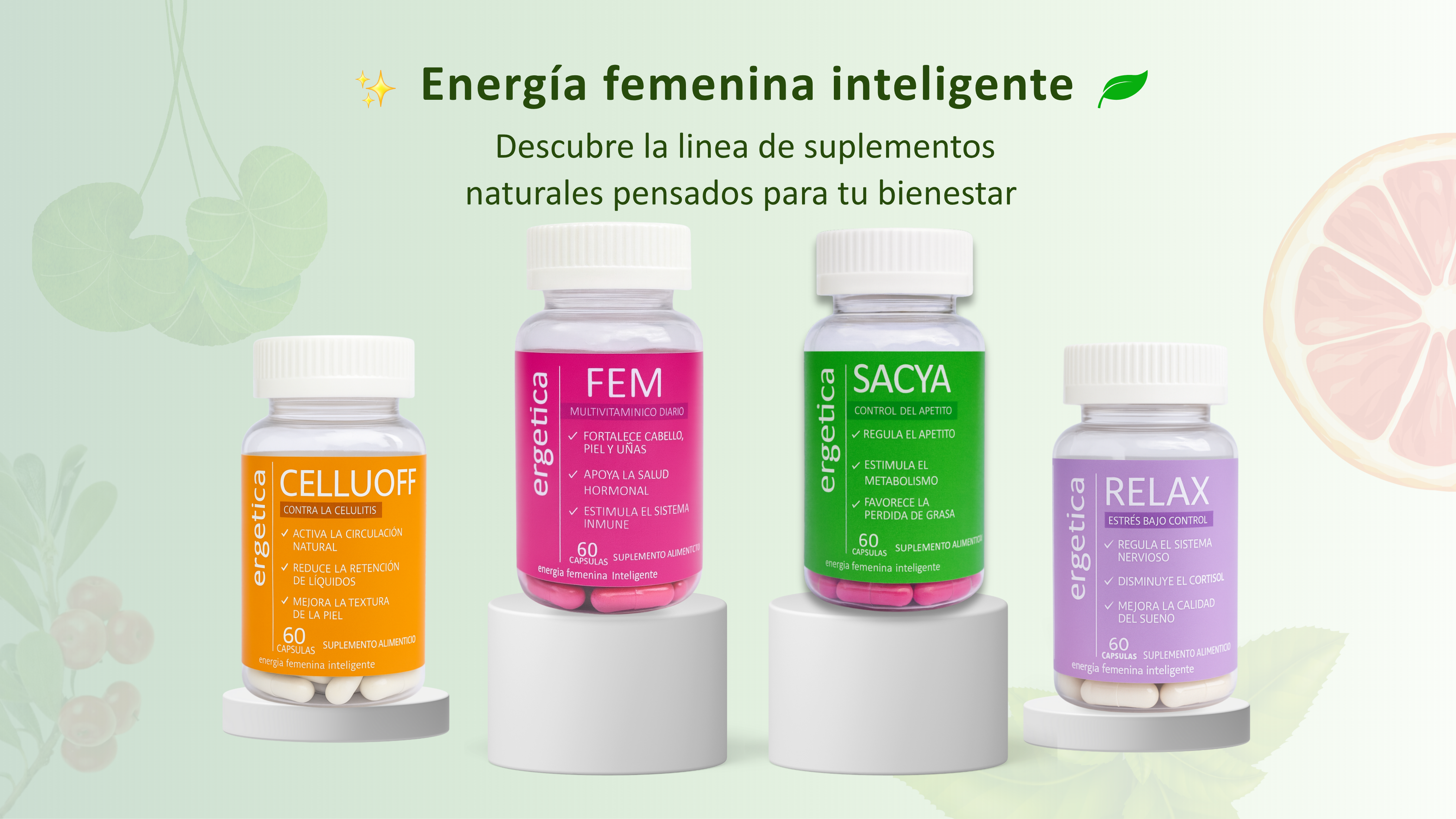 Contamos con 4 fórmulas diseñadas para distintas necesidades: FEM (cabello, piel y uñas), Relax (estrés y sueño), Sacya (apetito y metabolismo) y CelluOFF (circulación y firmeza de la piel).